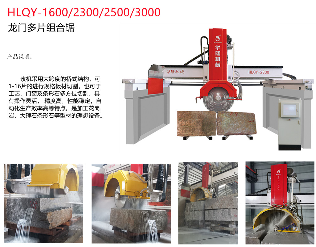 HLQY-2500 龙门多片组合锯是一款典范且适用的桥梁锯,可用于将石块切割成薄片或厚片。它接纳西门子 PLC 节制体系,配有油浸式直线导轨。最多可装置 18 片薄锯片。